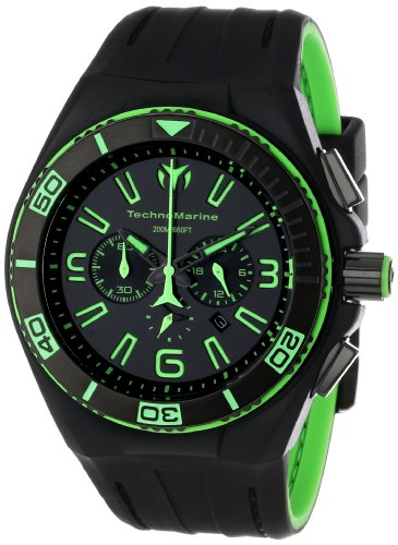 TechnoMarine Men's 112002 Cruise Original Night Vision Luminous Indexes Watch - Casual clock, Swiss quartz movement, chronograph, included: additional interchangeable strap Clear silicone with a brushed / polished black PVD steel clasp, clear silicone case cover and interchangeable tool clock, black luminous hands accents, Analog date display, bright engraved numbers and markers, brushed small Indexes green on outer dial concave lime, PVD coated stainless steel silver-tone black unidirectional bezel with lime green accent ring numbers blacks set set in emphasis on a lime green enamel and engraved indices / polished stainless steel black PVD coated case, screw-down crown and selector buttons, stainless steel Polished silver-tone screw, interchangeable black silicone strap, TechnoMarine Men's 112002 Cruise Original Night Vision Luminous Indexes Watch.